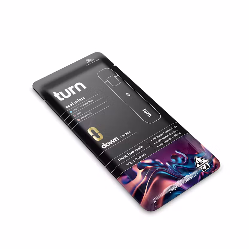 With 90% THC, smooth fruity flavor, and premium live resin oil, the Turn Disposable 1.0g AIO Acai Mints 100% Live Resin Indica Weed Pen delivers potent, clean, and convenient high-potency indica effects every time.