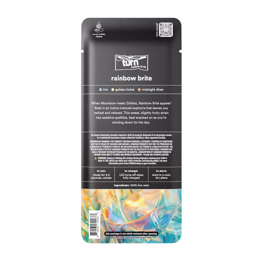Whether you’re a seasoned cannabis consumer or new to live resin disposables, the Turn Rainbow Brite AIO pen provides consistent vapor, authentic strain flavor, and premium oil quality in a sleek, ready-to-use device.