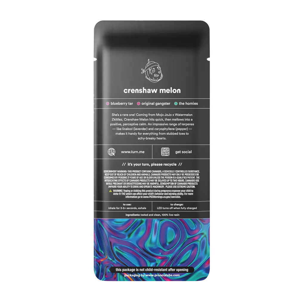 Crafted with 100% live resin, this disposable weed pen preserves the natural terpene profile of the Crenshaw Melon strain. Each puff delivers a sweet blend of juicy melon, tropical fruit, and subtle citrus notes, creating a smooth and aromatic vaping experience. Turn’s live resin extraction process captures the essence of fresh cannabis, ensuring a true-to-strain flavor that stands out from standard distillate pens. The result is a terpene-rich vapor that enhances both taste and overall enjoyment.