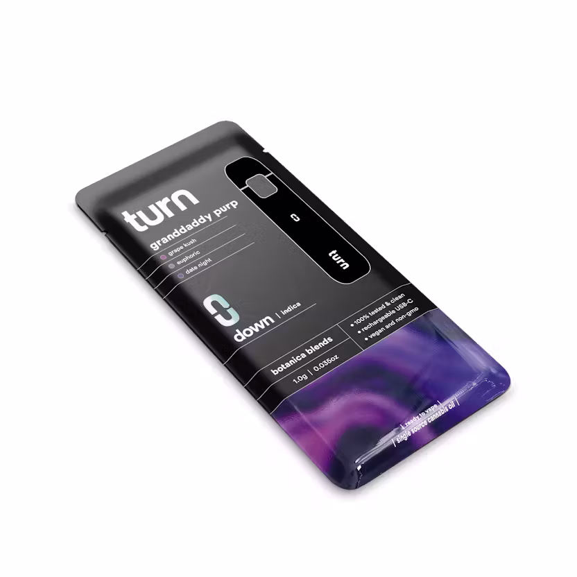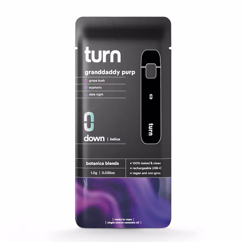 The Turn Disposable 1G AIO Granddaddy Purp Botanica Blends Indica Weed Pen delivers a powerful and classic indica experience built for deep relaxation, bold flavor, and effortless use. Featuring an impressive 93.20% THC, this premium disposable vape is perfect for cannabis consumers seeking strong effects, smooth vapor, and reliable performance in a sleek all-in-one design.