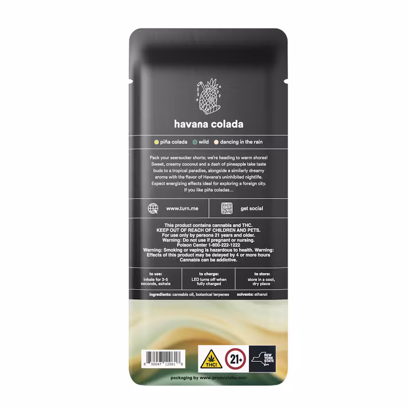 Transport your senses to a tropical escape with the Turn Disposable 1G AIO Havana Colada Botanica Blends Hybrid Weed Pen. Crafted with 90% THC, this premium hybrid disposable delivers smooth, flavorful vapor paired with balanced, feel-good effects. Inspired by the classic tropical cocktail, Havana Colada blends creamy coconut, sweet pineapple, and subtle citrus notes for a rich, island-style vaping experience that feels indulgent and refreshing at the same time.