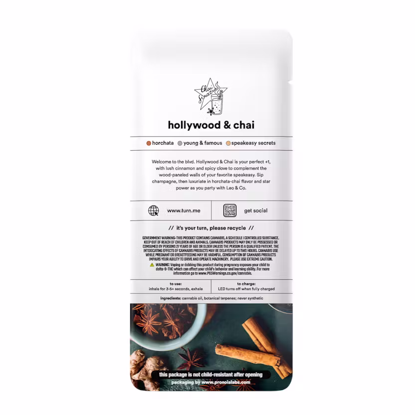 The Hollywood & Chai flavor profile combines warm, spiced chai notes with subtle sweet undertones for a unique and luxurious vaping experience. Each inhale delivers creamy cinnamon, nutmeg, and black tea flavors complemented by natural botanical terpenes, creating a smooth and aromatic draw. Turn Botanica Blends ensures consistent flavor throughout the disposable, making this vape ideal for users who appreciate complex, dessert-inspired cannabis flavors. Hollywood & Chai provides a refined taste that elevates every puff and leaves a memorable flavor impression.