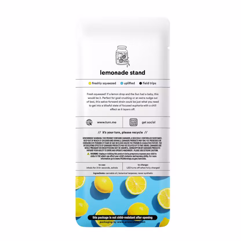 Turn’s disposable vape pens are engineered for portability and discretion. The Lemonade Stand Botanica Blends pen is slim, lightweight, and pocket-friendly, making it ideal for travel, outdoor events, or casual sessions. Its discreet design allows for private use without compromising style or performance.