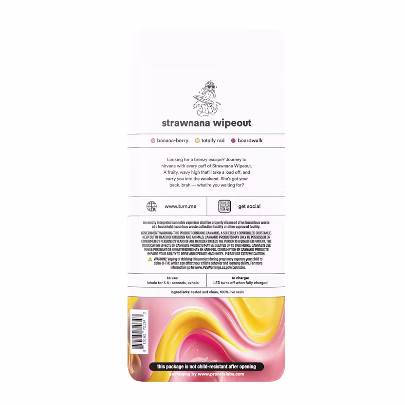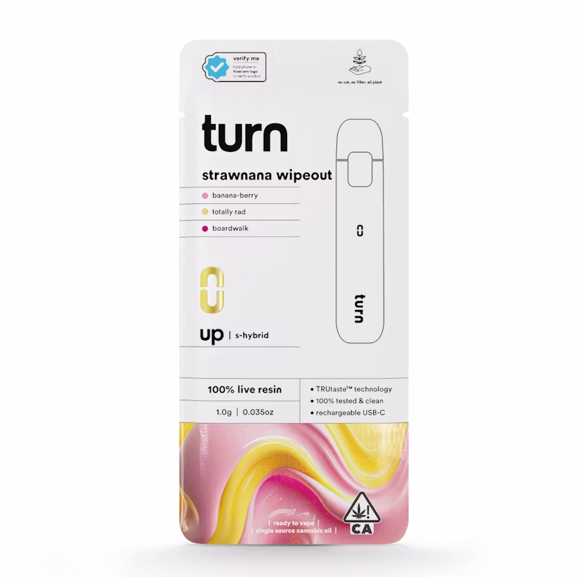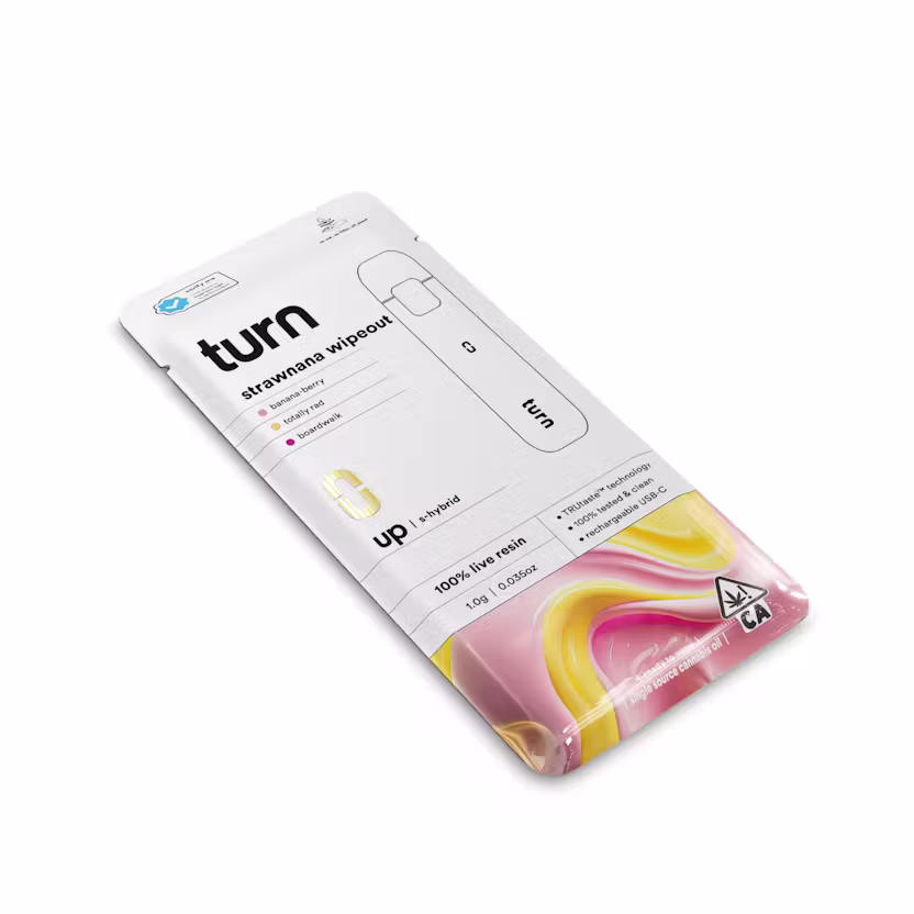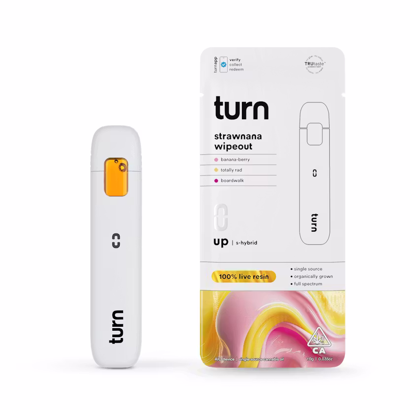 With 79.37% THC, sweet strawberry-banana flavor, and premium live resin oil, the Turn Disposable 1G AIO Strawnana Wipeout Hybrid Weed Pen delivers a clean, flavorful, and balanced cannabis vaping experience every time.