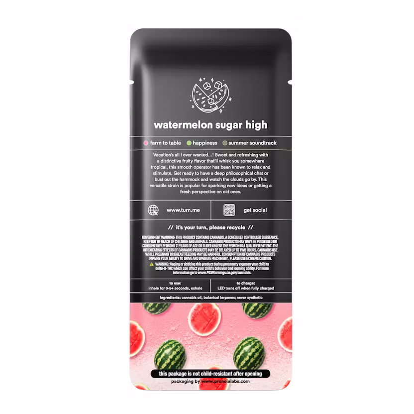 Experience sweet, fruity bliss with the Turn Disposable 1G AIO Watermelon Sugar High Botanica Blends Hybrid Weed Pen. Infused with an impressive 94.20% THC, this premium hybrid disposable vape offers a perfect balance of uplifting cerebral effects and relaxing body sensations. Watermelon Sugar High combines bright, juicy watermelon flavors with subtle herbal undertones, creating a smooth, flavorful vape that delights the senses.