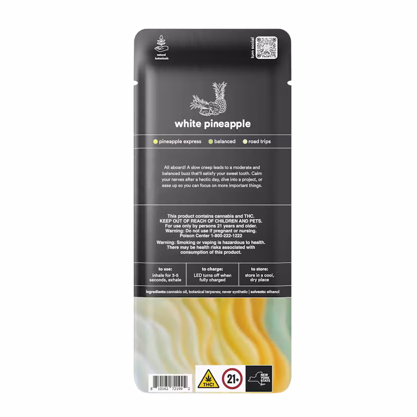 Indulge in tropical sweetness with the Turn Disposable 1G AIO White Pineapple Botanica Blends Indica Weed Pen. Boasting a potent 94.35% THC, this premium disposable vape delivers smooth, flavorful hits paired with deeply relaxing indica effects. White Pineapple combines juicy pineapple notes with subtle earthy undertones, creating a dessert-inspired vaping experience that is both refreshing and soothing.