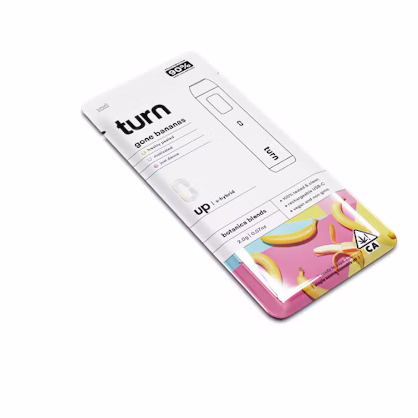 Elevate your cannabis experience with the Turn Disposable 2G AIO Gone Bananas Botanica Blends Hybrid Weed Pen, a premium 2-gram all-in-one disposable THC weed pen designed for users who value bold flavor, smooth effects, and effortless convenience. Powered by an impressive 90% THC, this sleek disposable vape delivers balanced hybrid performance paired with a sweet, tropical banana-inspired profile. Whether you’re enjoying a creative afternoon or winding down in the evening, Gone Bananas offers a versatile and satisfying session every time.