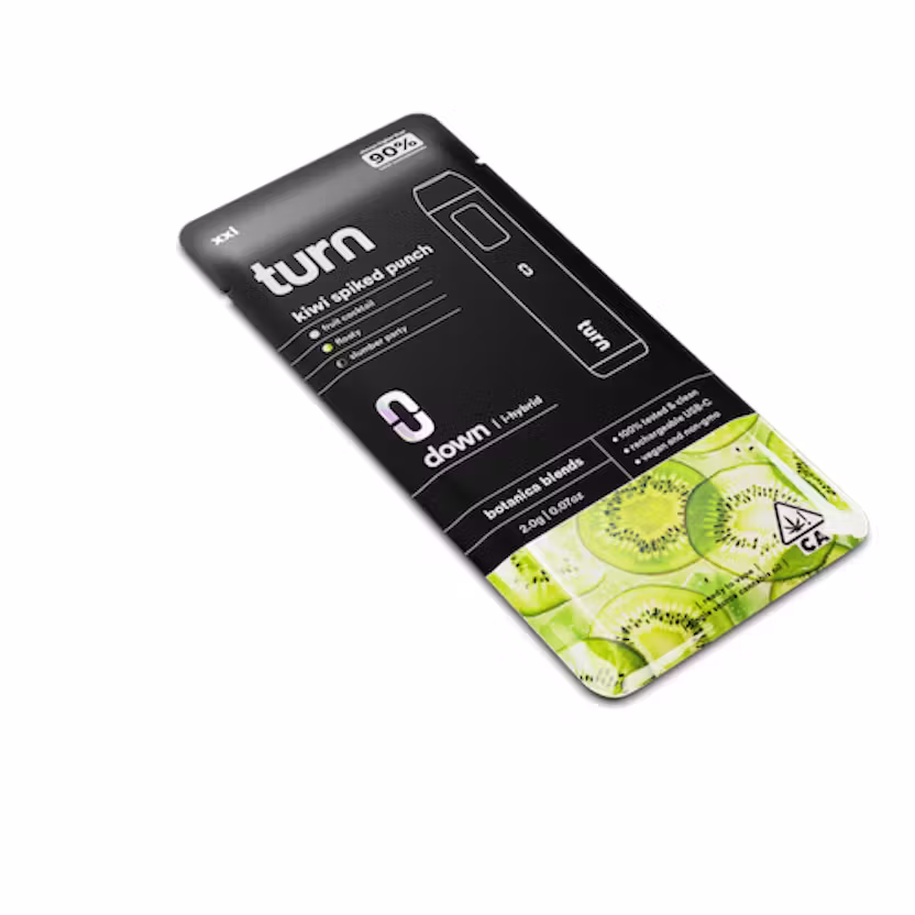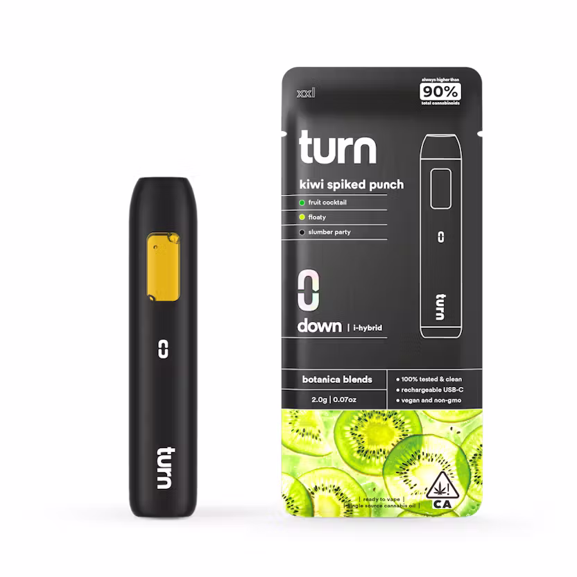Refresh your vaping routine with the bold and fruity Turn Disposable 2G AIO Kiwi Spiked Punch Botanica Blends Hybrid Weed Pen. Crafted for cannabis enthusiasts who appreciate powerful effects and vibrant flavor, this premium disposable vape pen delivers a potent 90% THC concentration paired with smooth, balanced hybrid effects. Kiwi Spiked Punch combines sweet and tangy fruit notes with reliable performance, making it an excellent choice for both casual and experienced users.