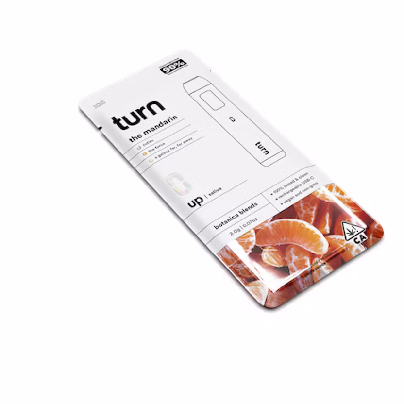 Elevate your cannabis experience with the Turn Disposable 2G AIO The Mandarin Botanica Blends Sativa Weed Pen, a premium 2-gram all-in-one disposable THC weed pen designed for users seeking flavorful, uplifting, and convenient sessions. Packed with 90% THC, this sleek disposable vape delivers smooth, energizing sativa effects, combined with the bright, tangy, and sweet flavor of fresh mandarin. Perfect for daytime focus, creative projects, or socializing, The Mandarin offers a refreshing and invigorating cannabis experience for enthusiasts of all levels.