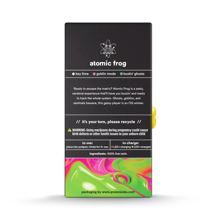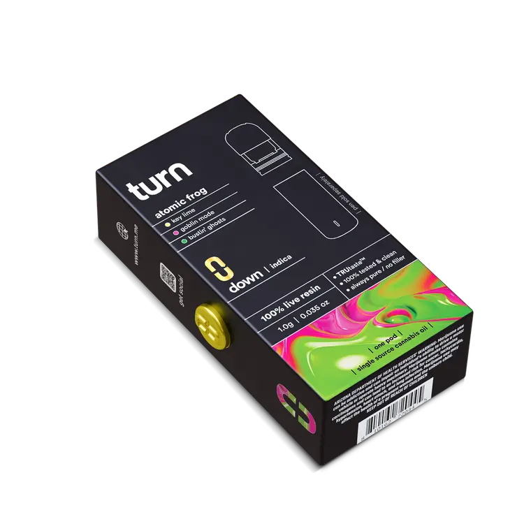 Turn Pods Atomic Frog 1G combines authentic live resin flavor, high THC potency, and premium hardware in one top-tier Indica vape pod. The live resin extraction preserves natural terpenes, while the 90% THC content ensures strong and satisfying effects.
