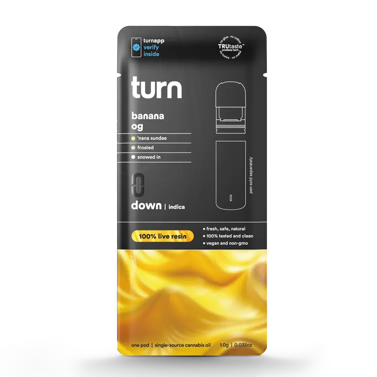 Turn Pods Banana OG features an indica profile known for calming and relaxing effects. Users often experience a soothing body sensation that helps reduce tension while promoting mental ease. This makes the pod ideal for evening use, quiet downtime, or moments when relaxation is the main goal.