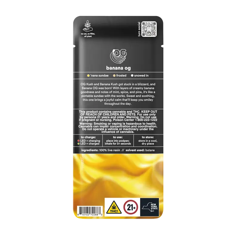 One of the biggest advantages of the Turn Pods Banana OG vape pod is its 100% live resin formula. Live resin is extracted from fresh frozen cannabis plants, helping preserve cannabinoids and terpenes that create the strain’s natural aroma and taste. This process results in richer flavor, smoother vapor, and a more true-to-strain experience compared to traditional distillate vape options.