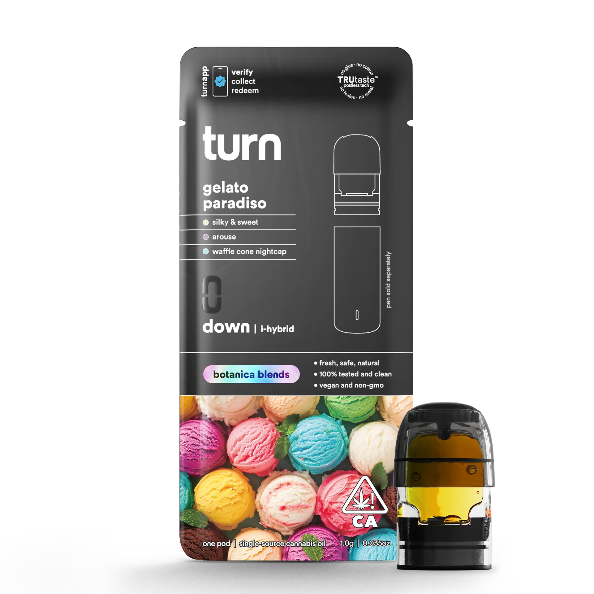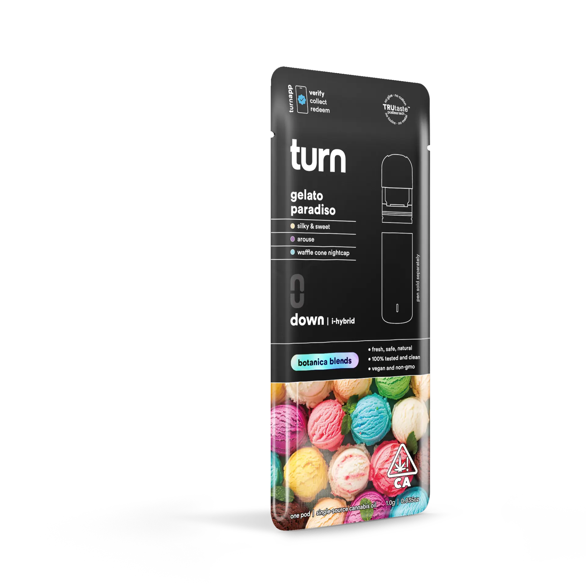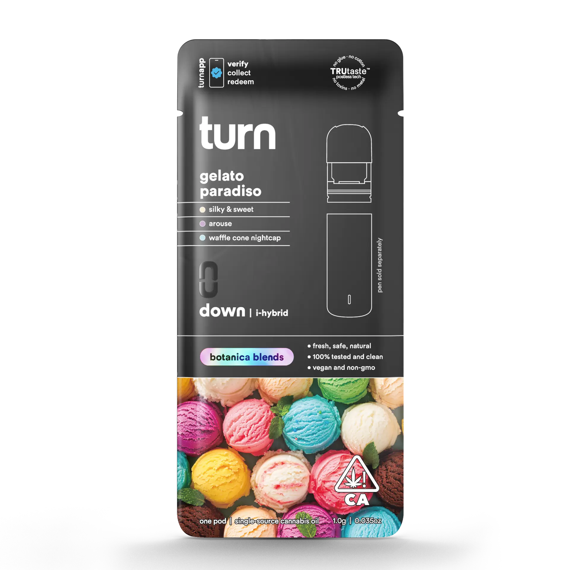 Turn’s Botanica Blends terpene formulations are crafted to enhance both flavor and effect. Gelato Paradiso’s terpenes complement the hybrid strain profile, providing a smooth onset, balanced high, and satisfying finish. Every draw emphasizes natural flavor, making this pod a standout for anyone who values a high-quality, flavorful THC experience.
