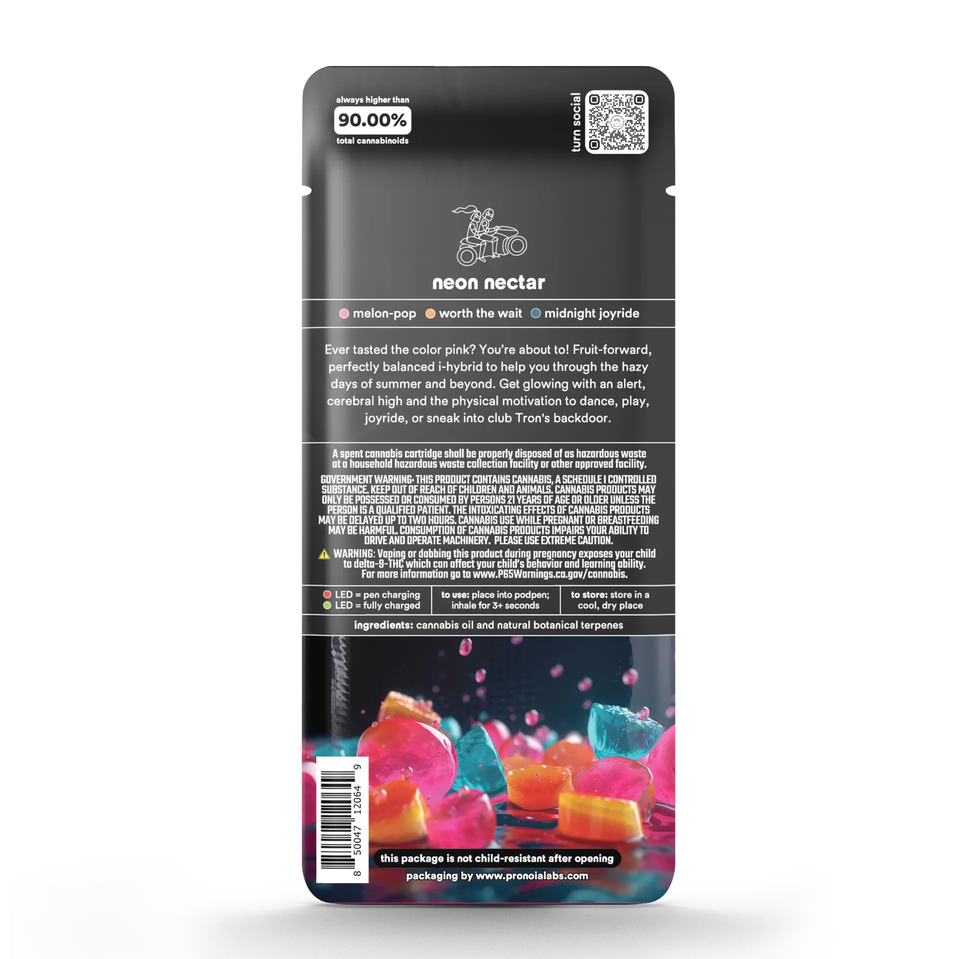 Formulated with 90% THC, the Turn Pods Neon Nectar 1G PodPen provides fast-acting, long-lasting effects with every draw. The potency ensures that even experienced users can achieve desired effects with fewer puffs, while still maintaining a smooth and manageable experience. This makes it a strong choice for users seeking efficiency without sacrificing flavor or balance.