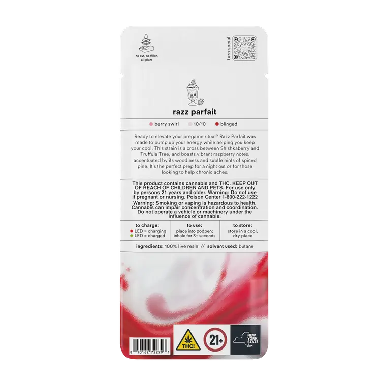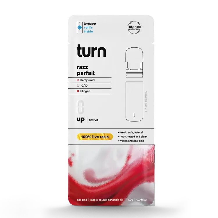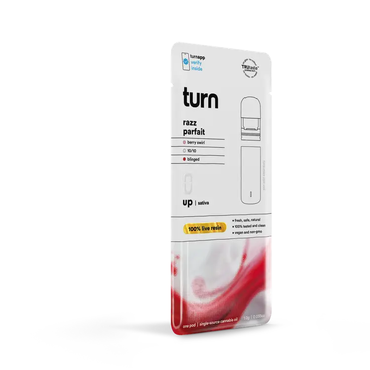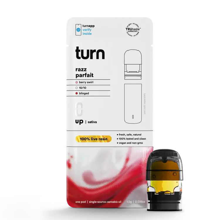 Turn Pods Razz Parfait uses premium 100% live resin extract made from fresh frozen cannabis plants. This process helps preserve the strain’s natural terpene and cannabinoid profile. As a result, every inhale delivers bold flavor and a more complete cannabis experience compared to standard distillate pods.