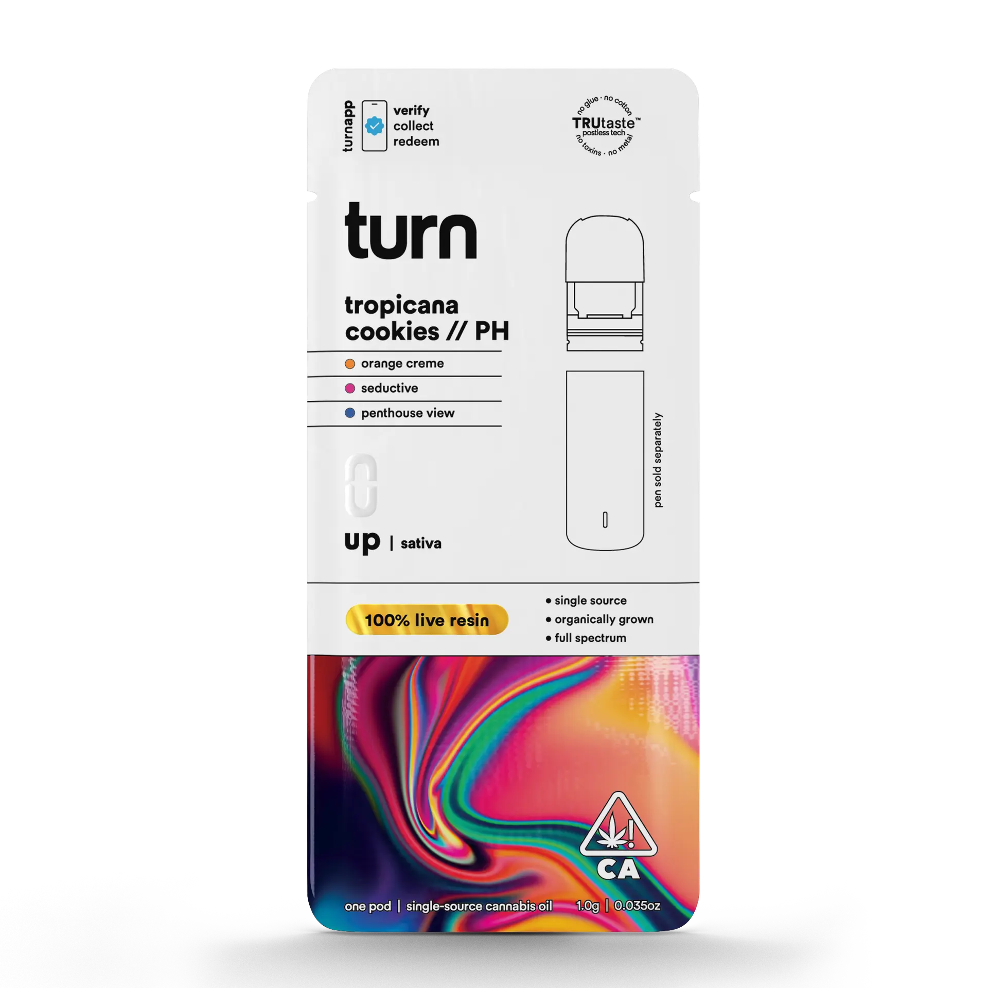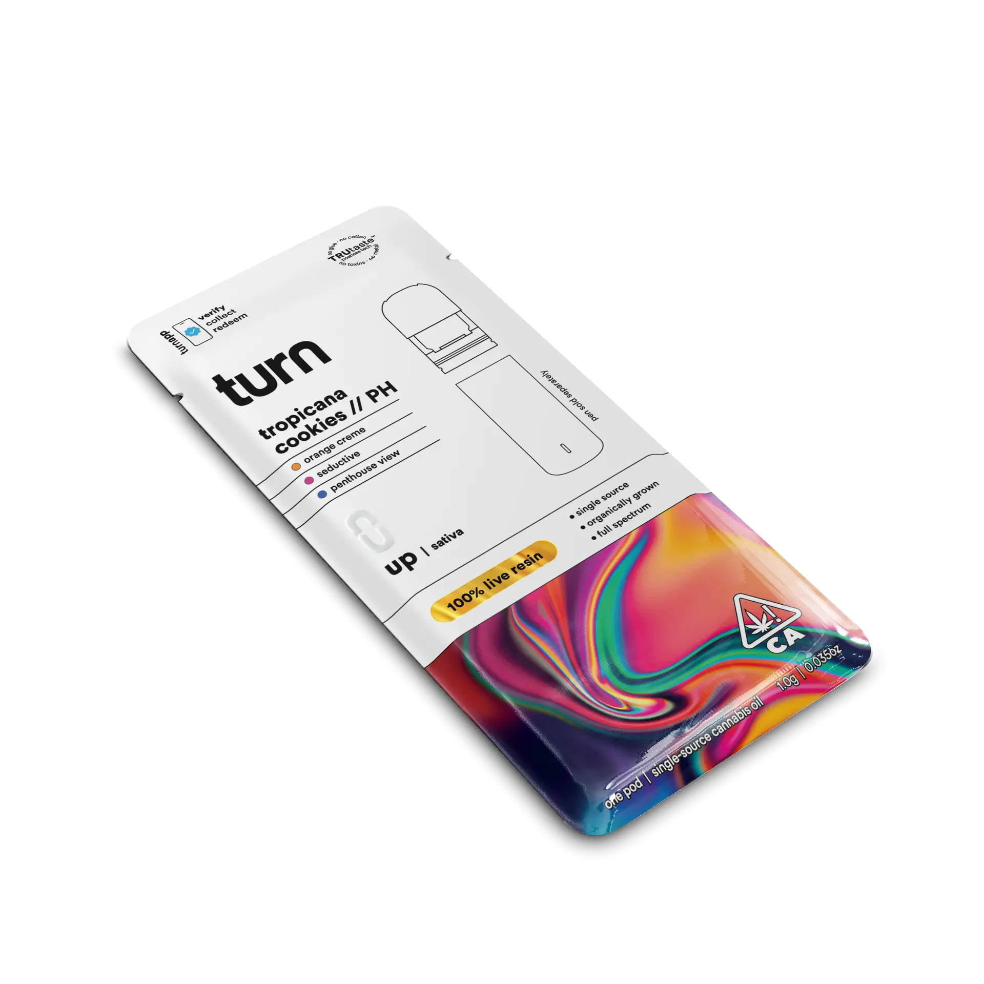 The Turn Pods Tropicana Cookies // PH 1G 100% Live Resin THC Vape Pod combines tropical dessert flavors, balanced hybrid effects, and smooth, high-quality vapor. Every draw delivers authentic, strain-accurate flavor with consistent, potent effects. Perfect for cannabis users seeking a flavorful, versatile hybrid vape with premium live resin quality, this pod is a must-have addition to any collection.