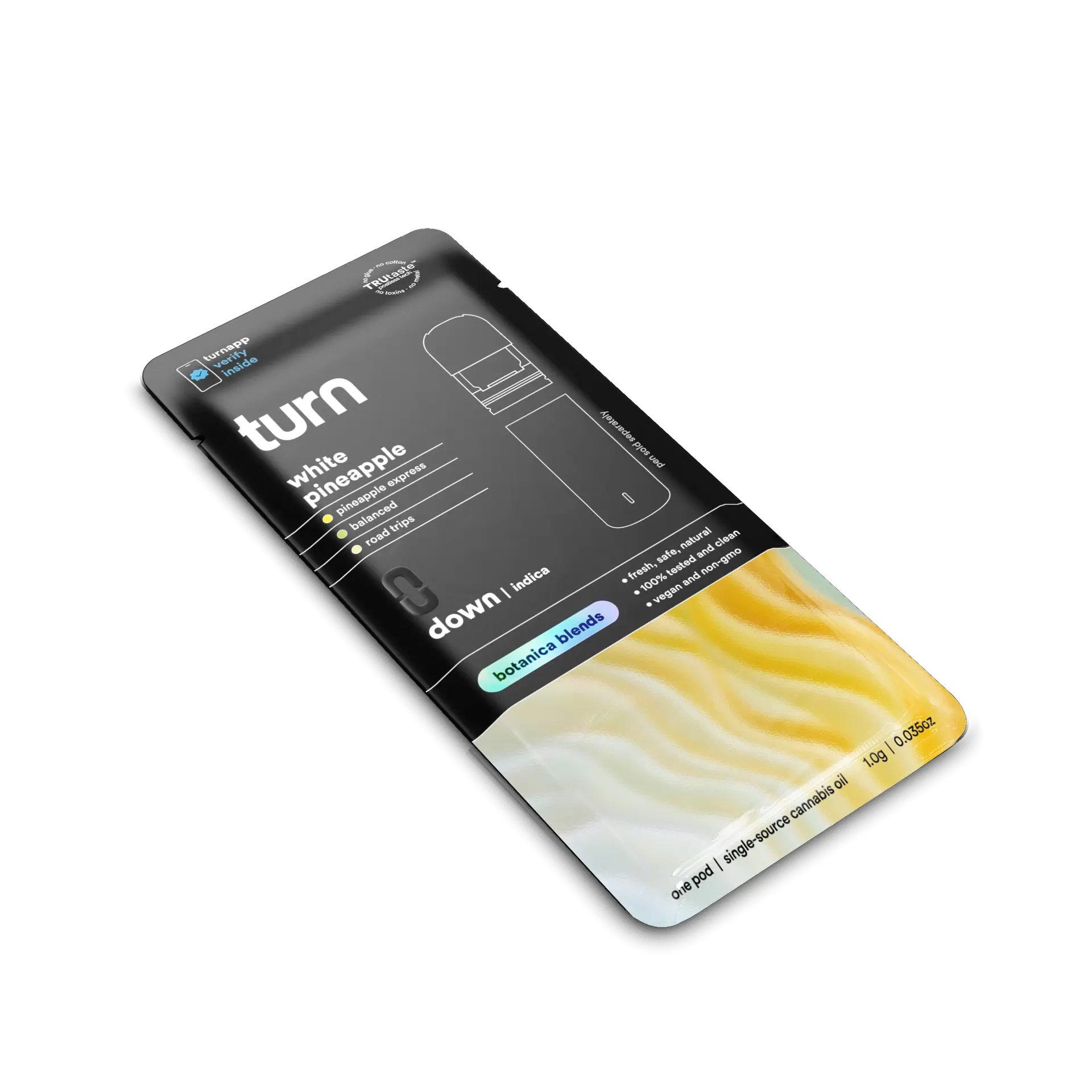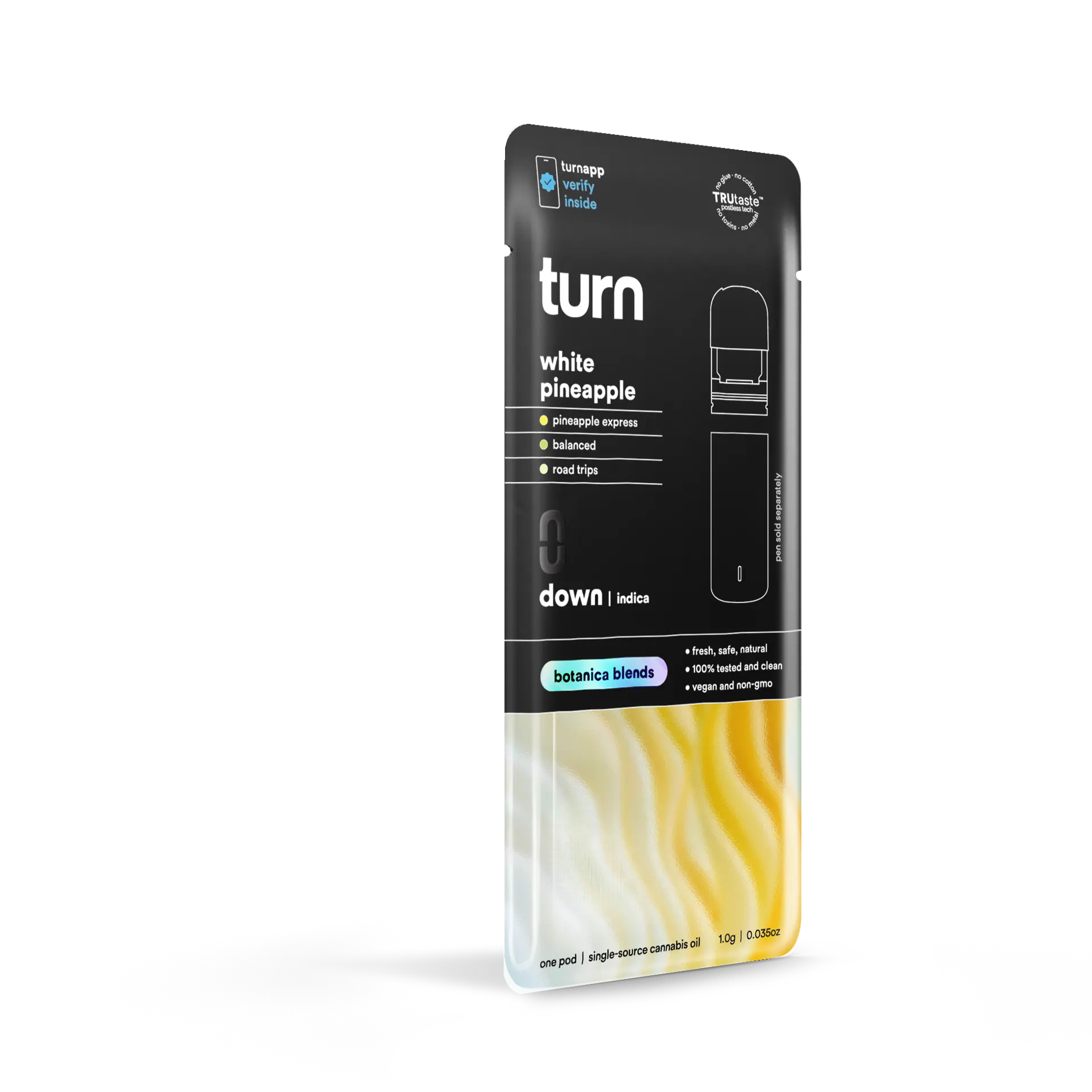 Elevate your relaxation with the Turn Pods White Pineapple 1G Botanica Blends THC Vape PodPen, a premium indica THC pod designed for smooth vapor, potent effects, and effortless use. With 90% THC, this 1G pod delivers fast-acting, long-lasting effects, making it ideal for evening relaxation, unwinding after a busy day, or quiet personal sessions. Crafted with high-quality Botanica Blends terpenes, White Pineapple combines sweet tropical pineapple flavor with the calming, soothing effects of a classic indica, providing a flavorful and satisfying vaping experience for both new and experienced cannabis users.