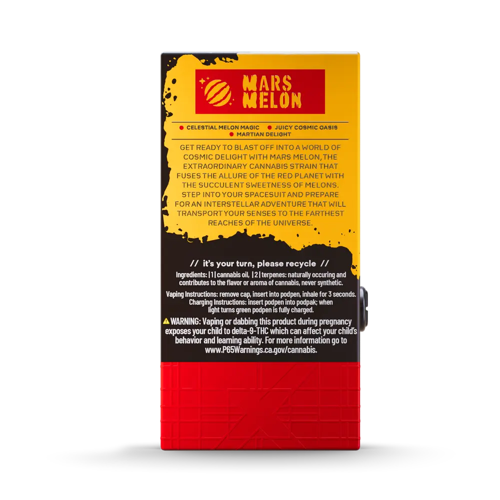 Each Mars Melon disposable is filled with high-quality, lab-tested THC oil created for purity, potency, and flavor. Free from unnecessary additives, this clean oil delivers a smooth and dependable vaping experience. Naturally derived terpenes enhance the sweet melon taste while supporting a balanced hybrid effect profile.