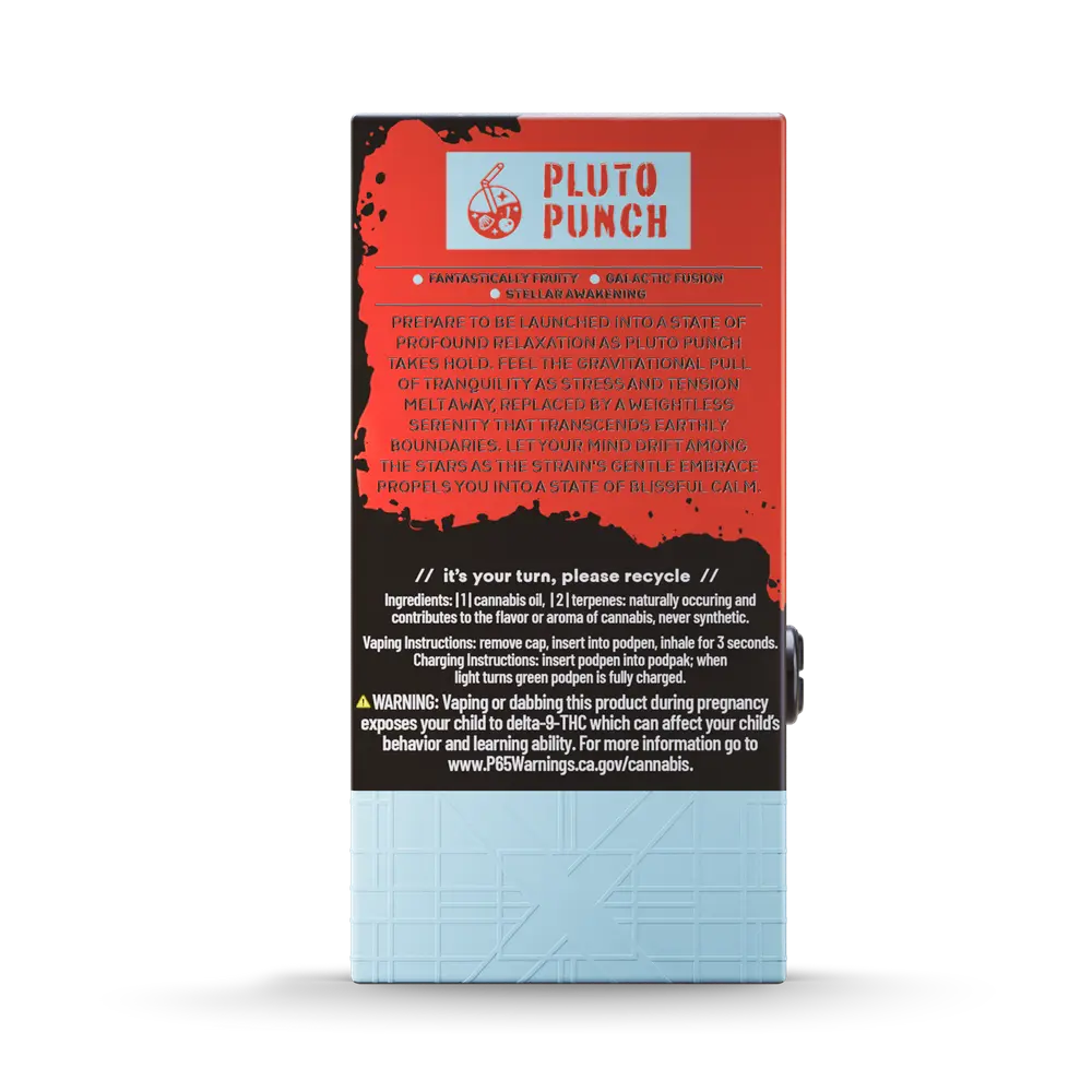 The Pluto Punch disposable vape is crafted for indica users, delivering calming, body-centered effects with a subtle cerebral lift. Its smooth, aromatic vapor preserves natural terpenes, ensuring consistent flavor and potency from the first puff to the last.